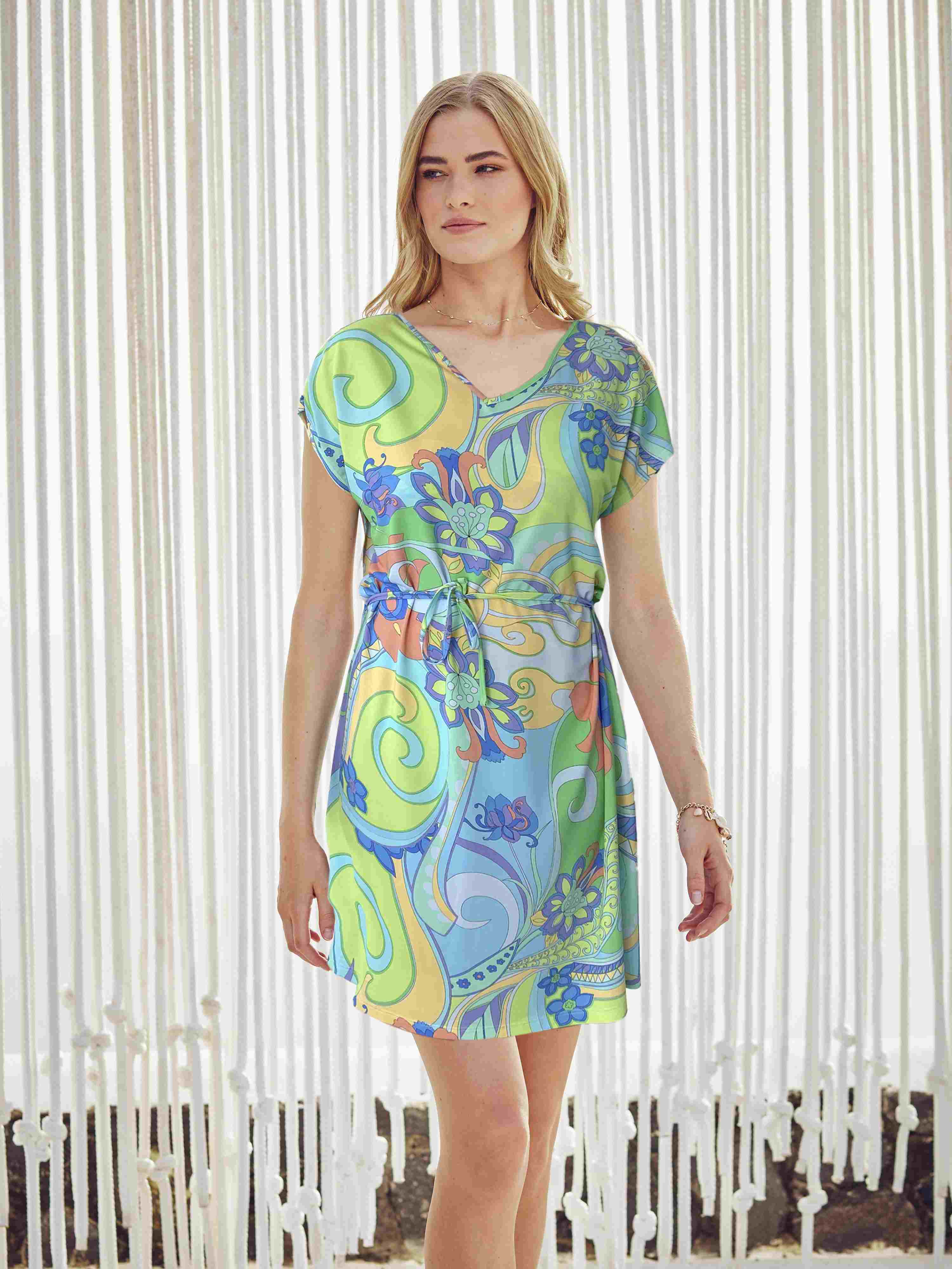 Capo d'Orlando ist eine üppig dekorierte Serie für einen lässigen Resort - Flair. Geprägt von floralen Elementen entsteht durch stilvoll kombinierte Farben ein stimmungsvoller Musterstrudel.Das luftige Kleid ist mit einem Tunikakragen und einem V-Ausschnitt, weiten Trompetenärmel und einer A-Silhouette.